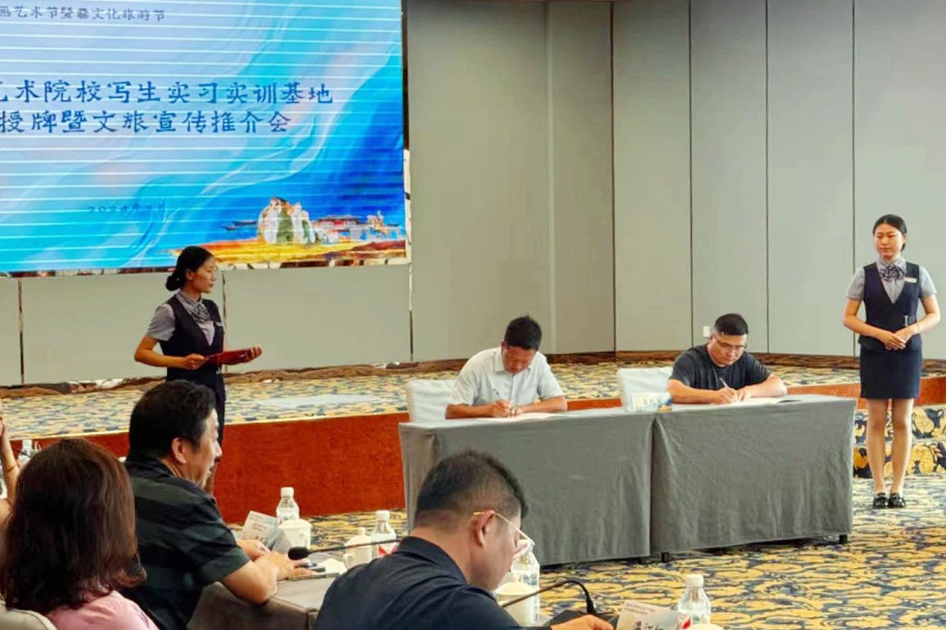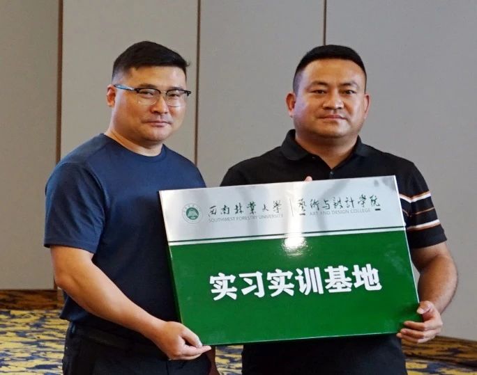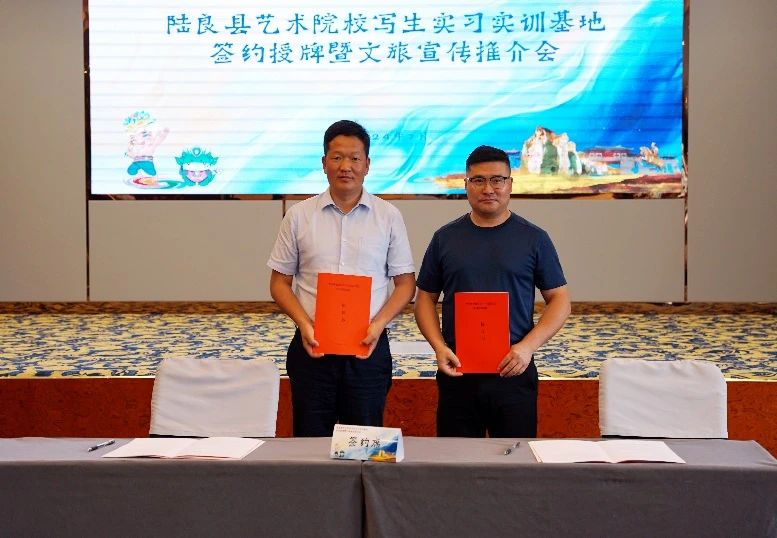 艺术与设计公司党委书记张德国与陆良县委常委、县人民政府副县长冯建磊代表甲乙双方在实习实训基地合作协议书上签字。张德国为陆良县三岔河镇荷花里颁授实习实训基地牌匾。