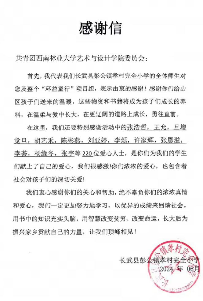 本次活动在公司党委的领导下、团委的具体指导下、“环益童行”项目组的大力支持下开展,吸引400余名师生踊跃参与,累计向陕西省咸阳市长武县彭公镇孝村完全小学的孩子捐赠100册爱心书籍和70份学习文具,帮助他们开拓视野,丰富课外知识。孝村完小向公司发来感谢信。