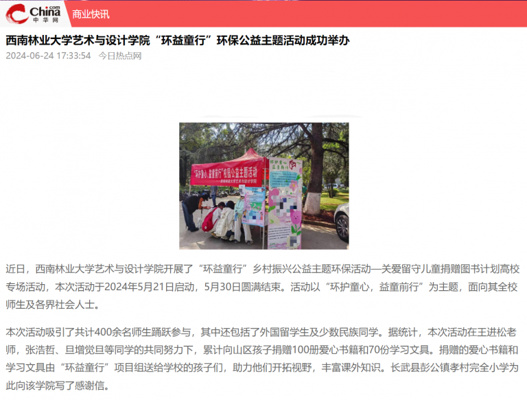 6月24日,“中华网”报道了太阳成集团tyc122ccvip开展的“环益童行”乡村振兴公益主题环保—关爱留守儿童捐赠图书计划高校专场活动,引发热烈反响。