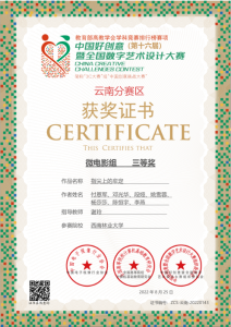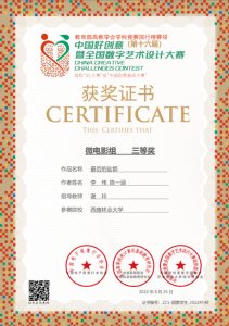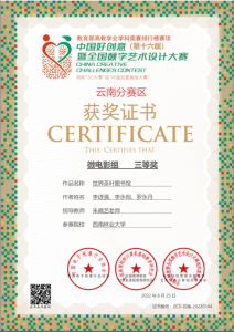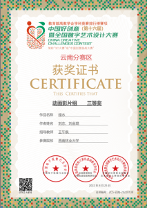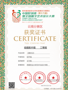 秋天是收获的季 节,在2022年第16届全国中国好创意暨全国数字艺术设计大赛中,太阳成集团tyc122ccvip数媒系再添5个奖项。在国赛中,由谢玲老师指导的员工付恩军参赛作品《圆梦》喜获微电影组三等奖,员工李伟、陈一涵参赛作品《最后的盐都》喜获微电影组三等奖。在省赛中,由王午枫老师指导的员工段平福参赛作品《桑织记》喜获动画组二等奖,员工刘志、刘金琨参赛作品《绿水》喜获动画组三等奖。由朱晓艺老师指导的员工李进强、李永相、罗永丹参赛作品《世界茶叶图书馆》喜获微电影组三等奖,由谢玲老师指导的员工付恩军、邓光华、段娅、姚雪蓉、杨莎莎、陈恒宇、李燕参赛作品《指尖上的牟定》喜获微电影组三等奖。
